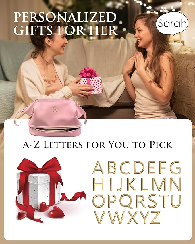 Gifts for Teen Girls, Initial Large Makeup Bag, Personalized Double Layer Cosmetic Bag with Makeup Brush Organizer, Waterproof, Large Capacity PU Leather Toiletry Bag, Friend gifts