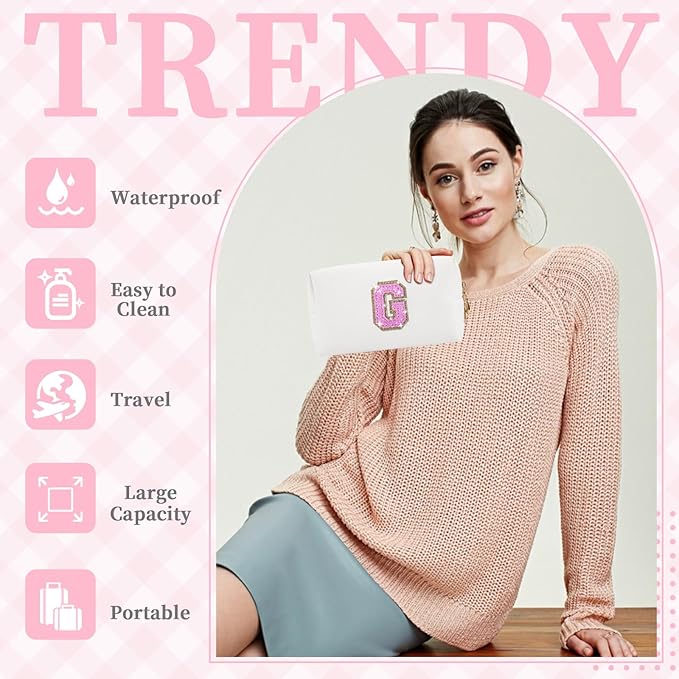 Small Initial Patch Makeup Bag Personalized Gifts Make Up Bag,White Cute PU Leather Glitter Letter Cosmetic Bag with Zipper,Trendy Portable Travel Toiletry Pouch,Preppy Stuff for Teen Girls Women G