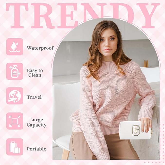 Small Initial Patch Makeup Bag Personalized Gifts Make Up Bag,White Cute PU Leather Glitter Letter Cosmetic Bag with Zipper,Trendy Portable Travel Toiletry Pouch,Preppy Stuff for Teen Girls Women G