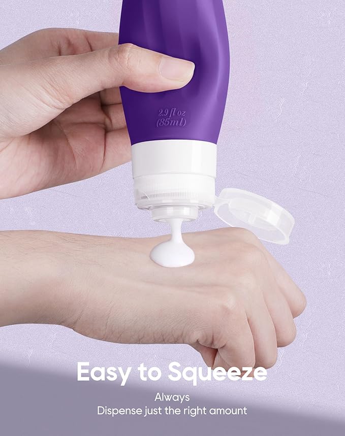 - SAFE SILICONE MATERIAL: Made of Food Grade BPA Free Silicone, this travel set is sturdy, soft, squeezable, flexible and reusable. Safe material guarantee that you can not only use them to store shampoo, conditioner, face soap, sunscreen, creams, lotion or etc, but also safe for food, various seasonings. Soft silicone body make you squeeze out contents easily