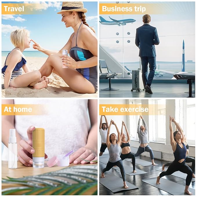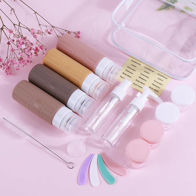 - 【Multiple & Useful】This is a practical travel toiletry container set inside a zipper bag, which includes 18 items: 4 travel bottles, 4 travel Jars, 1 spray bottle, 1 press bottle, 4 Scoopers, 1 funnel, 1 cleaning brush and 1 Page label, and 1 clear toiletry bag. The rich travel accessories can almost meet your whole family needs, and make your traveling more organized, easier and pleasant. Take them on the go!