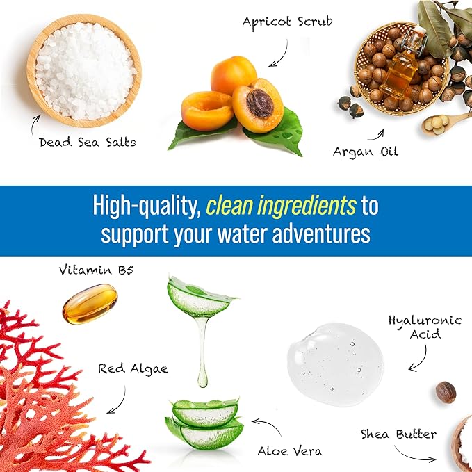 - AFTER-SWIM BODY WASH: Our cooling body wash for swimmers is formulated with natural red algae, vitamin E, and argan oil to cleanse and rejuvenate skin, while removing the scent of chlorine