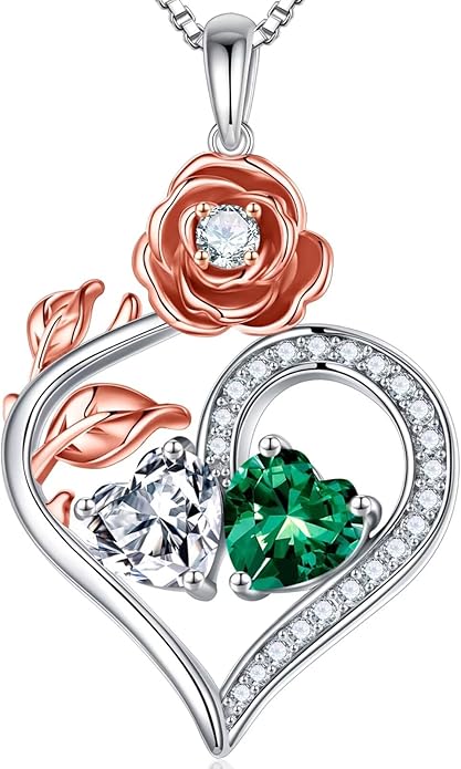 Iefil Rose Heart Birthstone Necklaces for Women - 925 Sterling Silver Double Birthstone Necklace, Anniversary Birthday Gifts for Women, Jewelry Gifts for Wife Her