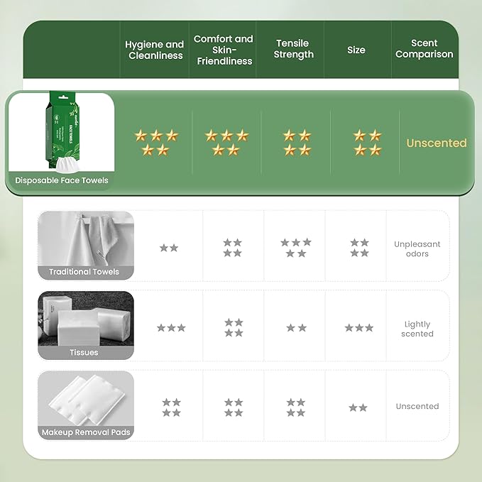 - Ultra Soft & Safe - Our biodegradable face towels are made from 100% rayon fabric, making them twice as strong, softer, and gentler than regular tissue paper. These gentle, unscented dry disposable face towels are safe and effective for all skin types, including normal, oily, dry, or sensitive skin.