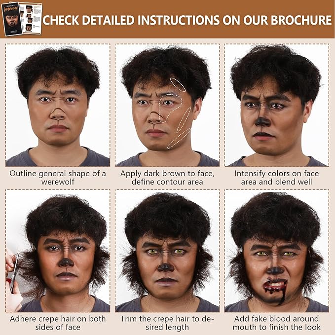 - 【General Application Steps】Step 1: start with bare face, use black liner pencil to outline shapes on nose and upper lip; Step 2: add thin layer of dark brown around face, add a second layer to temples, under cheekbones and around the eyes; Step 3: apply the black to darken the eye circle and define the snout, philtrum and upper lip; Step 4: use light brown to soften the edges for natural seamless transition; Step 5: use spirit gum to adhere the fur in small sections on both side of face; Step 6: set the makeup and add the dripping blood as needed.