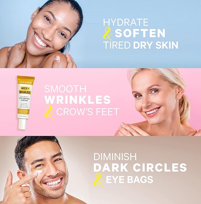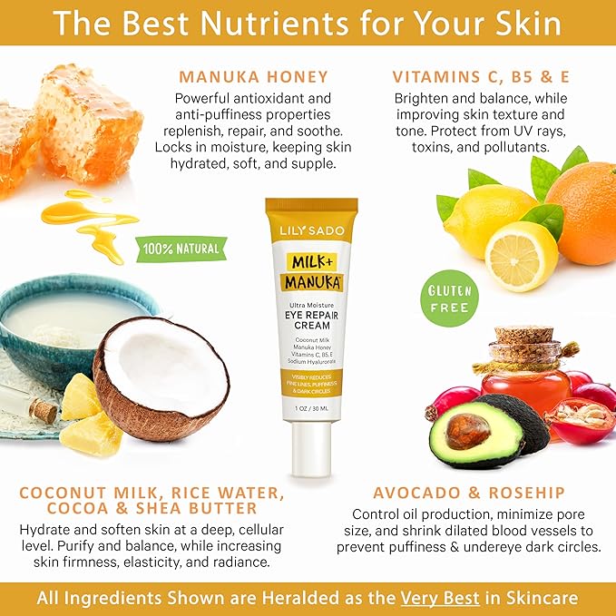 LILY SADO MILK+MANUKAโข Eye Repair Cream - Anti-Aging Natural Gentle Formula w/Coconut Milk, Manuka Honey, Sodium Hyaluronate & VITS C, B5 & E - Prevents Puffiness, Under-eye Wrinkles & Eye Bags - 1oz