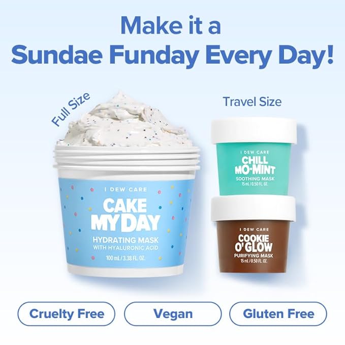 I DEW CARE Wash Off Face Mask Set - Sundae Scoop | Hyaluronic Acid Skincare Essentials, Moisturizing, Hydrating, Soothing, Exfoliating, Dry Sensitive Skin, Stocking Stuffers, Travel Size, Mini Set