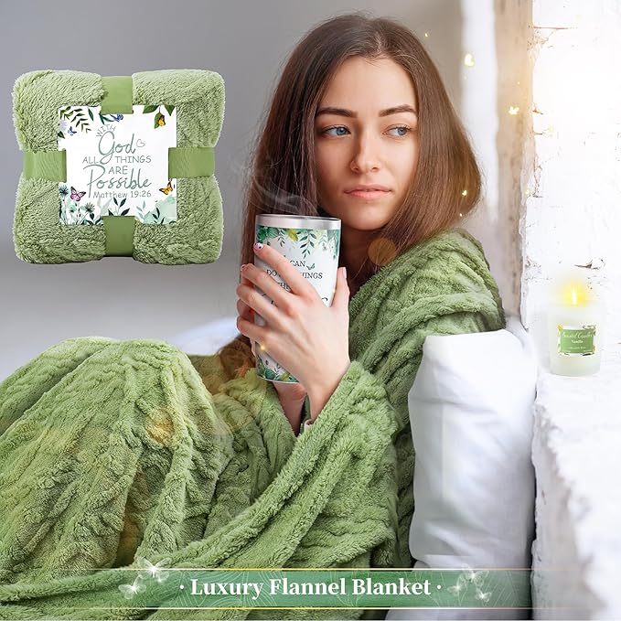 - ๐ฅVALUE FOR MONEY ๐ -The christian gifts baskets come with 13 different beautiful items, 40 x60 inches Bible blanket, 7oz 50-hour scented candle, 20oz Christian tumbler with straw and brush, Bath Bomb, Butterfly Desk Decor Inspirational Engraved Keepsake, Diamond Handed Soap and Greeting Card. Each pattern is carefully designed by our designers to represent our support and blessing