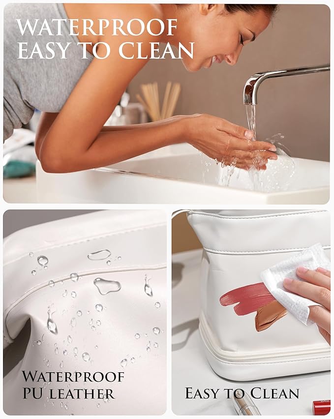 - 【High-Quality Materials】Our travel toiletry bag is made of soft, lightweight, and high grade leather fabrics that protect your makeup from scratches and splashes. It's also waterproof, so you don't have to worry about water splashing on it when washing your hands.