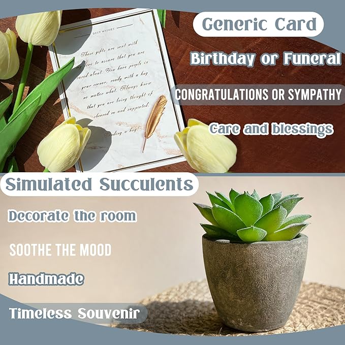- This universal gift box contains: 1 blanket, 1 mug, 2 pillowcases, 1 eye mask, 1 pair of socks, 1 simulated succulent, 1 soy candle, 1 bath ball, 1 bottle of bath salts, 1 handmade soap, and a universal greeting card. Our after-sales service team will start to serve you after you receive the package, please let us know if you encounter any problems, the team is committed to make all customers satisfied