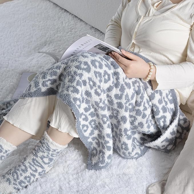 - Feather Yarn Blanket & Fuzzy Socks - 32"x48" Travel blanket, luxuriously soft blanket with leopard knitted pattern. Lightweight and breathable blanket for couch, easily carry with you wherever you go. And one size soft socks fits all womens' feet. Perfect girls gift for cozy nights in or travel.