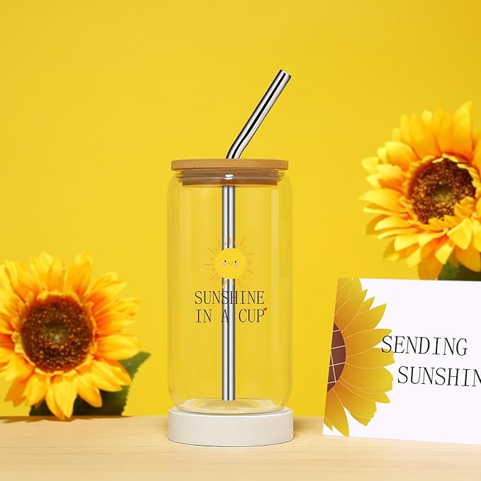 - 【Intimate Self Care Gift for Women】Indulge her senses with a 39 x59 inches Sunflower Blanket,a 16oz Glass Tumbler with bamboo lid and straw, featuring a whimsical quote, "A Cup Of Sunshine For You." Alongside, find a soft socks, 1 * scented candle,1* cute sunflower keychain, 1* cosmetic bag, 1* heartfelt greeting card, 1 * bath bomb, 1 * scented natural soap, Each item is meticulously selected to bring joy and relaxation to her day.
