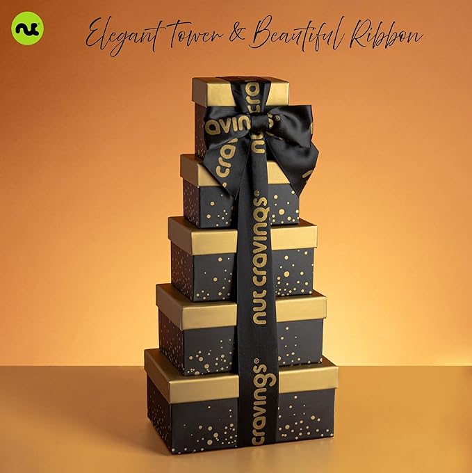NUT CRAVINGS - Diwali Chocolate Covered Pretzels & Caramel Popcorn Gift Basket, in Black Tower + Ribbon (8 Assortments) Food Arrangement, Healthy Snack Care Package, Food Assortments