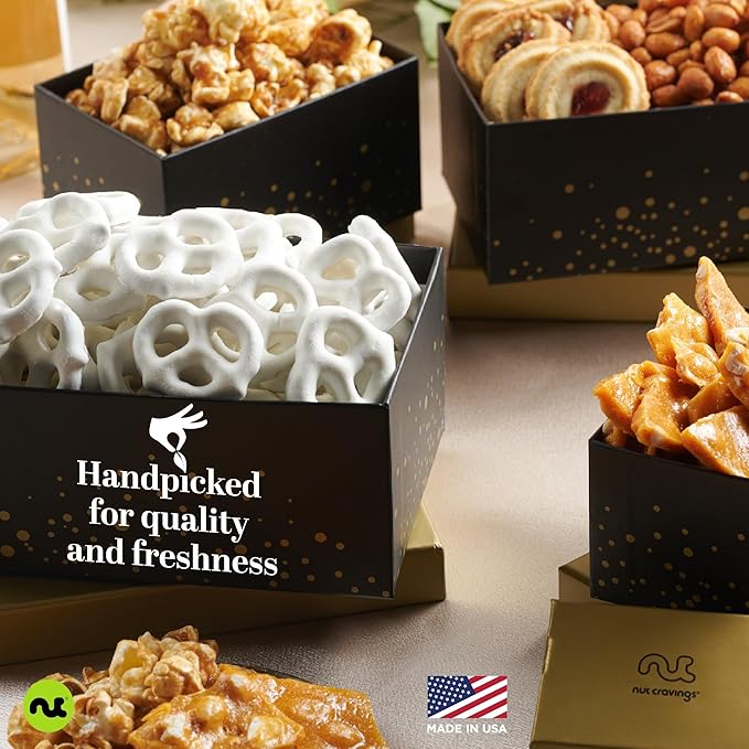 - A SELECTION OF 8 OF OUR BEST TREATS: Our Sweet & Savory Treats Gift Tower includes a delicious assortment of 8 signature snacks: Honey Roasted Peanuts, Yogurt Pretzels, Shortbread Cookies, Caramel Popcorn, Ghirardelli Chocolate, Peanut Brittle, Chocolate Malt Salt Water Taffies, and Chocolate Truffles.
