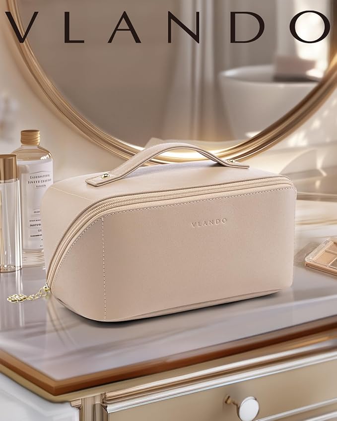 Vlando Makeup Bag,Gifts for Teachers,Large Capacity Toiletry Bag for Women Waterproof Portable Make up Pouch PU Leather Open Flat Cosmetic Bag(Toffee)
