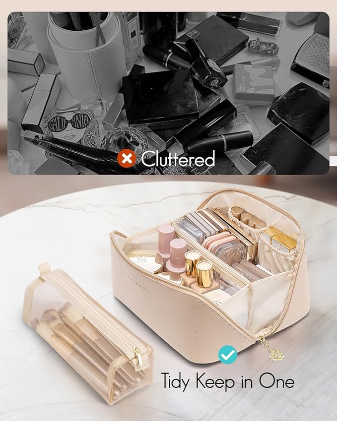 - Multiple Compartments: 2 large sections + 3 elastic pockets organize makeup/skincare. Middle zippered TPU pocket for small items; extra brush pouch keeps tools tidy and visible