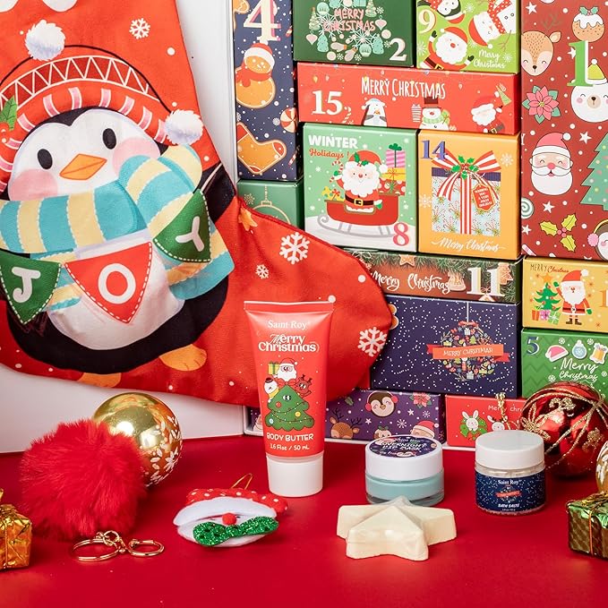 - 【Comprehensive Contents, All in One Box】The Spa kit include Soy candle, Bath fizzer, Body scrub, Body butter, Hand cream, Bath salts, Overnight lip mask with spoon, Face mask. The advent calendar has many Christmas elements, such as embellished Christmas trees, Christmas Stocking Fuzzy Sock Bag, Christmas Canvas Gift Bag with Drawstring, Christmas tattoo sticker, Christmas Hairpin, Christmas Hat, Christmas Santa Hanging Decorations, Fuzzy Christmas keychain etc.
