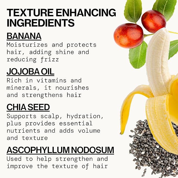 - NOURISHING BANANA & SUPERFOODS – Infused with real banana fruit extract, chia seed extract, and jojoba oil to maintain softness and shine even as you amp up the texture. Potassium-rich banana helps moisturize and protect hair, reducing frizz and adding a healthy-looking sheen. Chia seed and seaweed extracts provide lightweight hydration plus essential nutrients that support hair strength and elasticity. The result is touchable, beachy texture that’s still soft, hydrated and manageable.