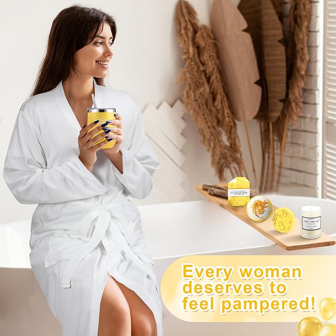 - Thoughtful and Practical: the spa gifts for women set includes 13 items, such as a bathrobe, coral fleece socks, eye cover, jewelry box, 12 oz thermal cup, stainless steel straw, mini mirror, scented candle, bath salt, bath bomb, shower tablet, shower soap, heartfelt card with dried flowers, and a quality box; This comprehensive collection caters to various needs and showcases attention to detail