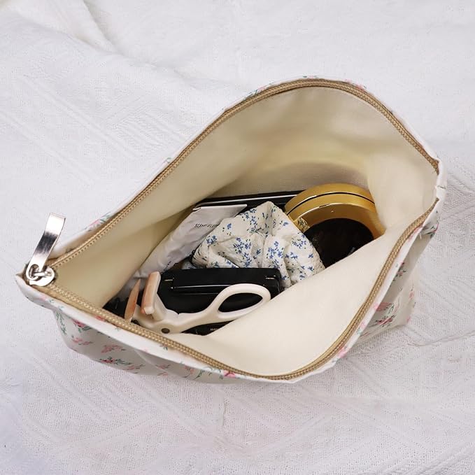 Wudygirl Flower Makeup Bag Cosmetic Bag for Women and Girls Large Capacity Makeup Pouch Aesthetic Cute Makeup Bag Canvas Toiletry Bag Pencil Pouch with Zipper (Beige and Small Floral)