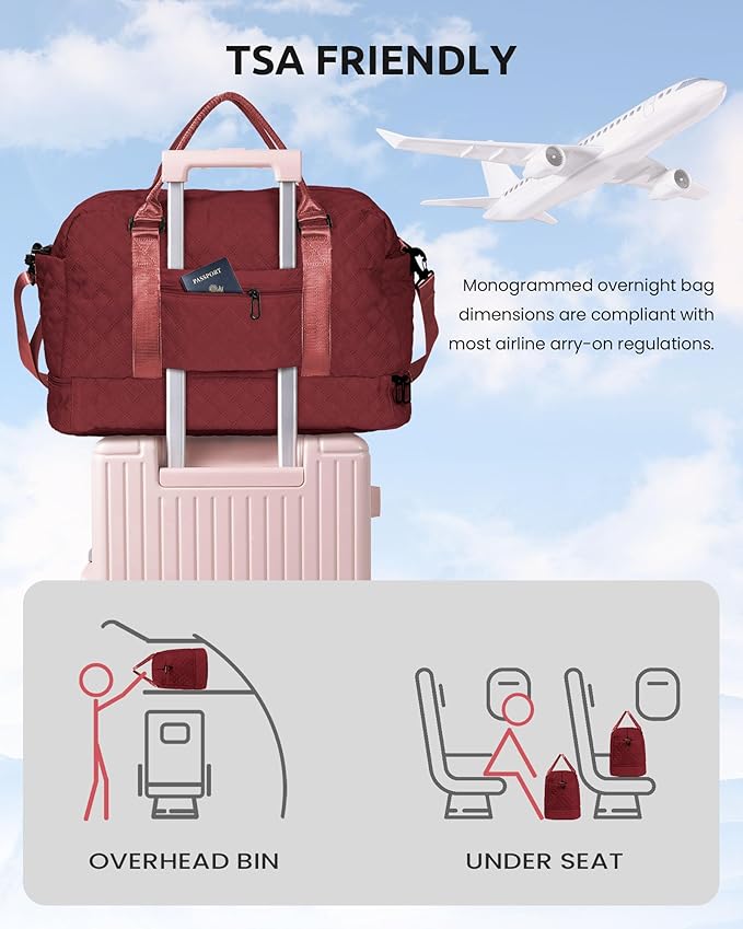 - 【Airplane Friendly Travel Bag】This Initial bag is designed to be the nice carry-on compliant bag for airline travel. It fits in the overhead compartment or under the seat as a personal item during flights. The back of the travel bag has a luggage strap that can be inserted and secured onto the handle of a suitcase, freeing your hands during business trips. It also features a back zipper pocket for storing your smartphone, ID, or passport.