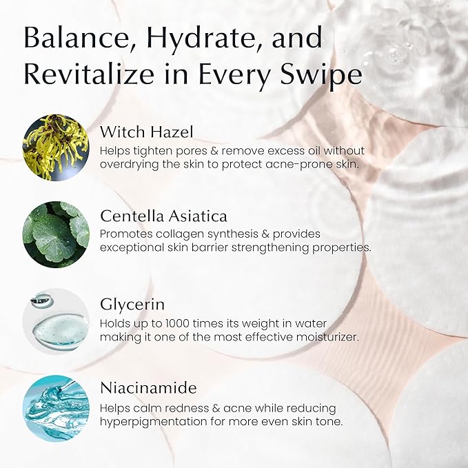 - Pure Hydration & Exfoliation: Formulated with Glycerin, Witch Hazel, Centella, and other powerhouse ingredients, these toner pads deliver a burst of hydration while soothing and calming your skin. No more dryness, no more irritation—just balanced, healthy skin that feels as good as it looks.