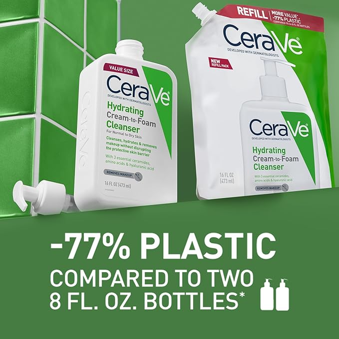 CeraVe Hydrating Cream To Foam Cleanser, Makeup Remover Face Wash For Dry Skin, Foaming Facial Cleanser With Hyaluronic Acid, Normal To Dry Skin, Fragrance Free & Non Comedogenic, 16 Ounce Refill