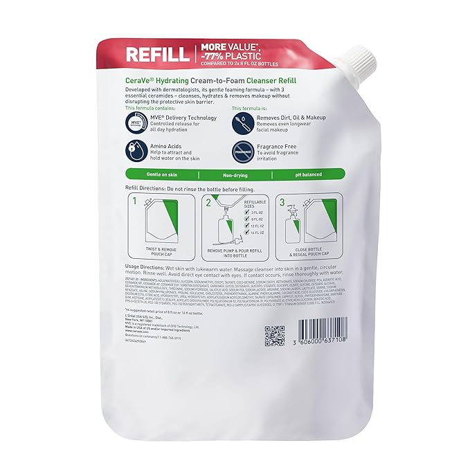 - [ ALL-IN-ONE DAILY FACIAL CLEANSER ] One-step skin care, foaming face wash for face & eye makeup removal while providing long-lasting hydration. Foaming cleanser gently removes dirt, excess oil, and even long-wear makeup and sunscreen residue. Now available in a refill format.