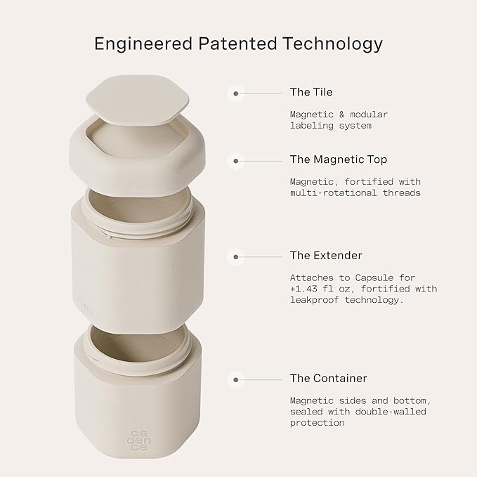 - PATENTED MAGNETIC DESIGN - Designed for seamless storage, our travel capsules feature a magnetic design that connects each container vertically or horizontally. They include magnetic labels that seamlessly swap between The Flex Small, The Flex Medium, and The Flex Large Capsules.