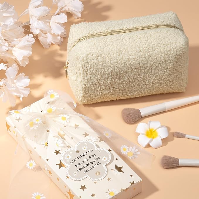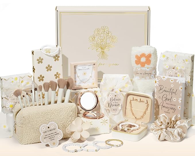 - 8 INDIVIDUALLY GIFT BOXES FOR GIRLS: This teen girl trendy stuff gift box is perfect for teen girls who appreciate stylish accessories and thoughtful keepsakes. Including Jewelry Box, 7 Bracelets, 1 Necklace with Box, Makeup Brushes(12 pcs), Fuzzy Makeup Bag, Makeup Mirror, Fuzzy Sock, Flower Hair bands & Flower Claw Clip, 8 task tags, daisy ribbons & gift card all in a big gift box. Whether for a birthday, holiday, or special occasion, it's guaranteed to make her smile and feel cherished