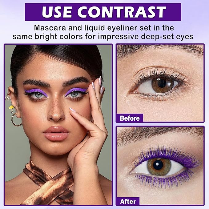 Purple Mascara and Eyeliner Set,5D Colored Volume and Length Waterproof,Purple Mascara for Eyelashes,Natural Lengthening Curling,Suitable for Women