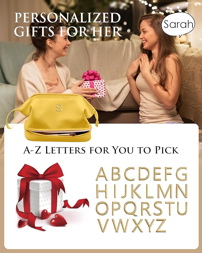Monogrammed Gifts, Initial Makeup Bag, Travel Gifts, Personalized Bags, Waterproof Double Layer Cosmetic Bag, Large Capacity PU Leather Makeup Bags Letter Travel Toiletry Bag, Friend Gifts