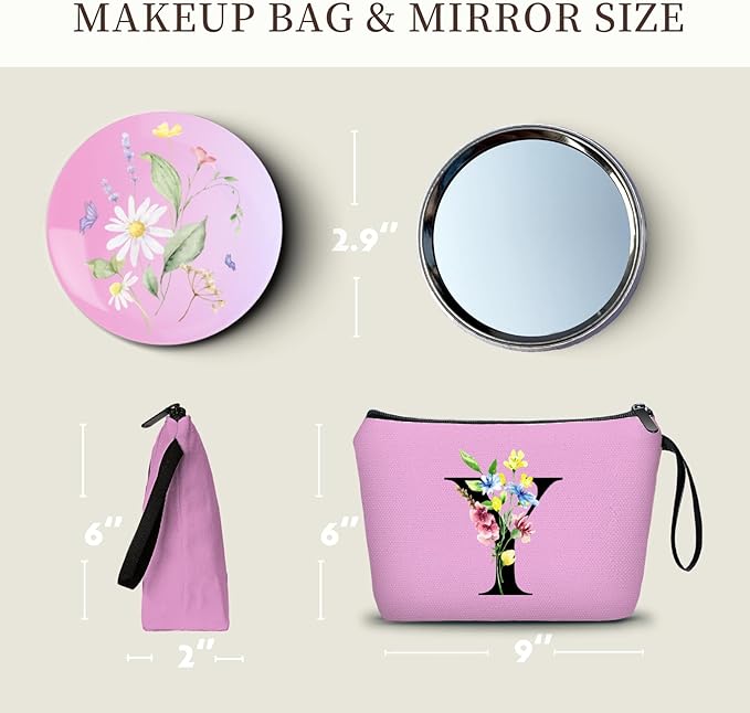 • BEST WOMENS GIFTS SET:This monogram gifts combination includes a makeup bag with "Y" printed on both sides and a small mirror.This is a perfect friendship gifts for women friends.