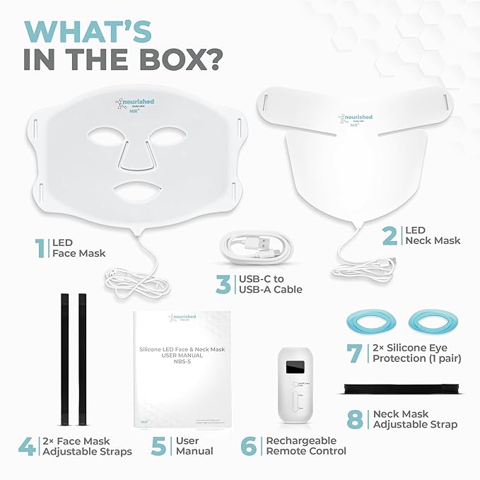 - 7-Mode Near-Infrared Light Therapy Mask Set: Features seven colors like red and blue lights, each added with NIR for deeper skin rejuvenation, offering high-precision LEDs with 35 mW/cm² irradiance