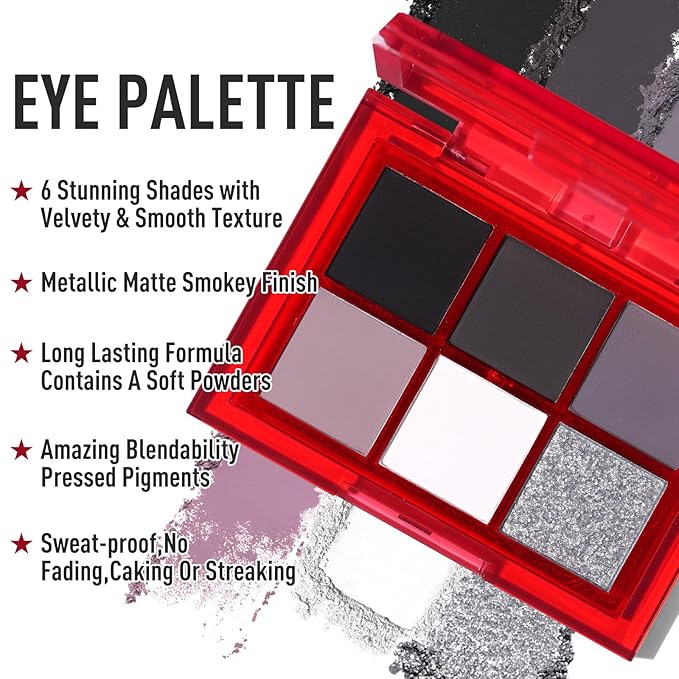 - EYESHADOW- 6 richly-pigmented shades with a unique combination of pressed shadows to feed your makeup obsession. It features mattes with black and white, dark and light gray, shimmer with metallic silver shade for anyone who loves this smokey vibe. This long lasting formula contains a soft powders which blends easily.