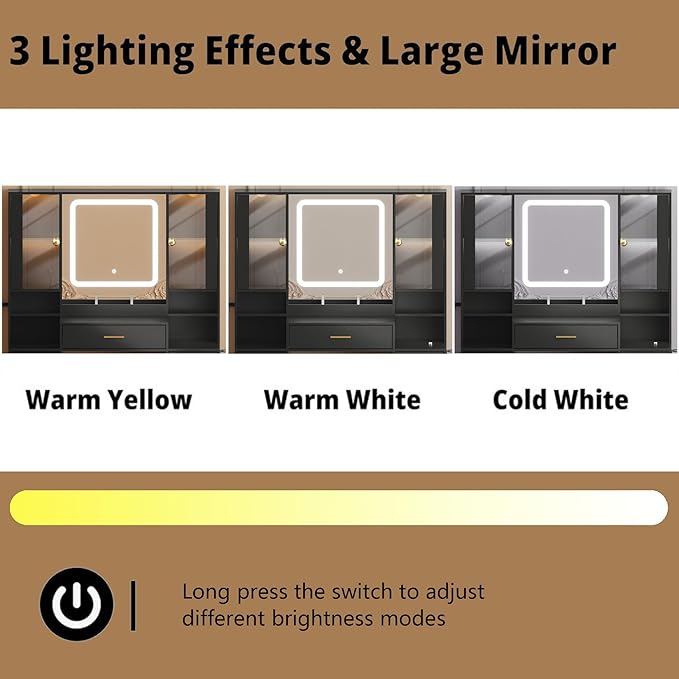 - RGB Cabinets with Glass Doors: BORNOON vanity desk includes glass cabinet doors with RGB LED lights, offering a wide range of colors and light modes. The RGB lighting adds a modern, stylish flair to your vanity. The Music Sync mode lets the lights flash in rhythm with your favorite songs, creating an immersive, unique environment for your beauty routine.