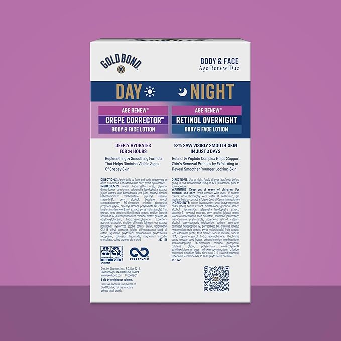 - Contains: One (1) 4.3-ounce tube of Gold Bond Age Renew Retinol Overnight Body & Face Lotion & One (1) 4.3-ounce tube of Gold Bond Age Renew Crepe Corrector Body & Face Lotion