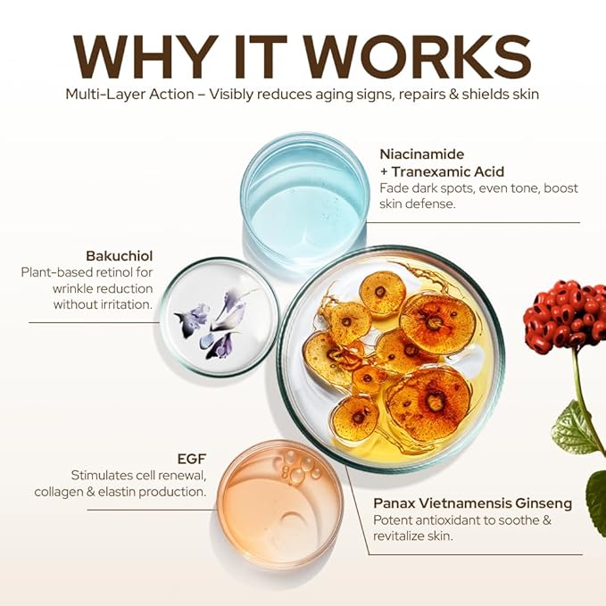 - Powered by 6-Year-Old Vietnamese Ginseng – Rich in rare Ginsenosides, this precious botanical energizes skin at the cellular level. It boosts vitality, improves elasticity, and helps skin recover overnight for a visibly renewed complexion.