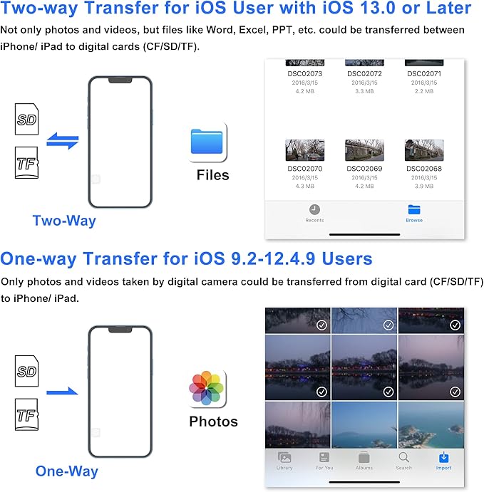 - [Two-way Transfer]: Two-way transfer suitable for iOS 13 -18 device. Import data from SD/TF card to iPhone/iPad, or export the file from iPhone/iPad to SD/TF card. Include Movies, Music, Word, Power point, Excel, PDF, etc.