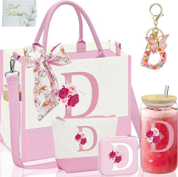 - The set includes: 16oz initial glass cup*1. Tote bag*1. Makeup bag*1. Jewelry storage box*1. Monogrammed pendant*1. Greeting card*1. Gift box*1. A beautiful personalized gift.
