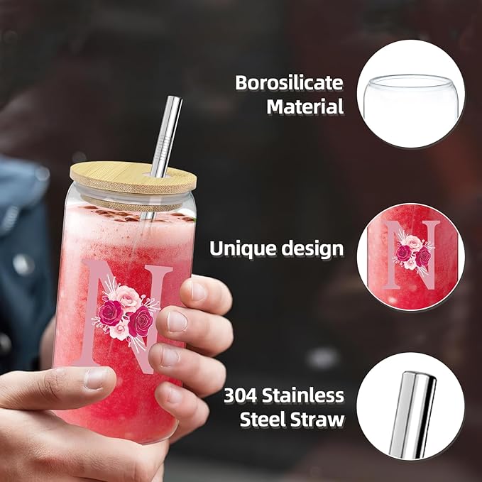 Monogrammed Gifts for Women,Personalized Gifts for Women,Initial Canvas Tote Bag,16oz Initial Glass Cup,Initial Makeup Bag,Initial Jewelry Organizer Box,Birthday Gifts for Aunt Niece-N