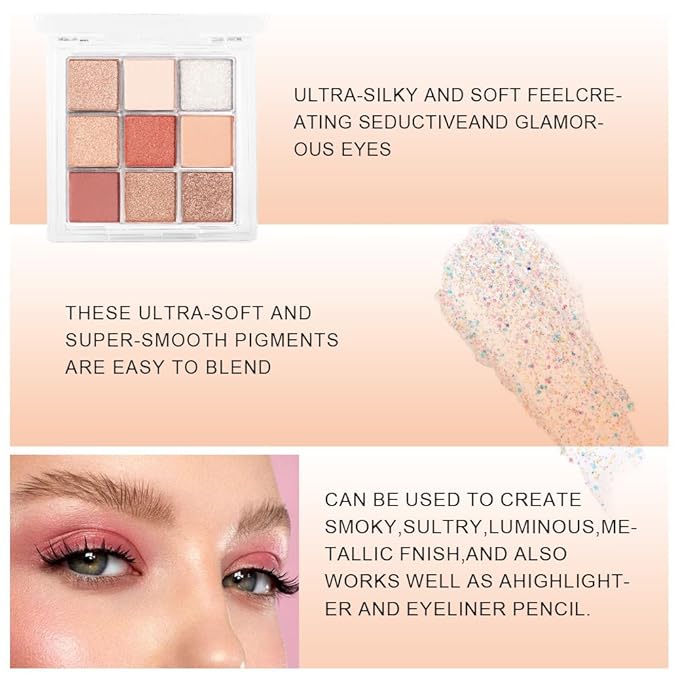 - 1. โจ 9 Gorgeous Shades in One Eyeshadow Kit This 9-color eyeshadow palette includes a perfect mix of Golden-brown glitter, Light beige matte, Light blue-green glitter, and Peach matte, making it an essential natural eyeshadow palette for everyday glam or bold statement looks.