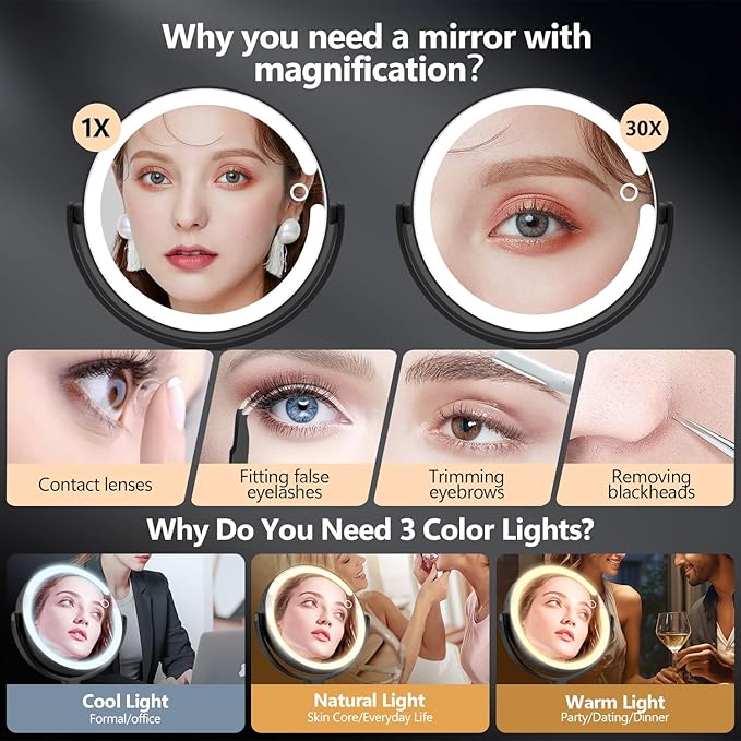 - Dual Side 1x/30x Magnifying Lighted Mirror: This magnifying makeup mirror comes with 1X and 30X mirror, the 1X is suitable for daily use and the 30x magnifying mirror is suitable for delicate operations such as eyelash plucking, eye lash installation, wearing contact lenses,and removing blackheads, it's not only suitable for young women, but also the first choice of makeup mirrors for seniors and cataract patients