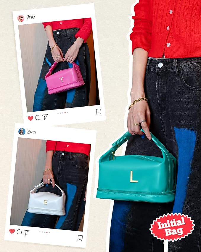- 【Double-layer Design】The monogrammed makeup bags is double-layer with a unique design of upper and lower storage areas. The bottom compartment is great for storing cosmetics, eye shadows, makeup brushes, and other items. The top layer features a large opening for easy access, along with two small compartments for lipsticks and earrings.