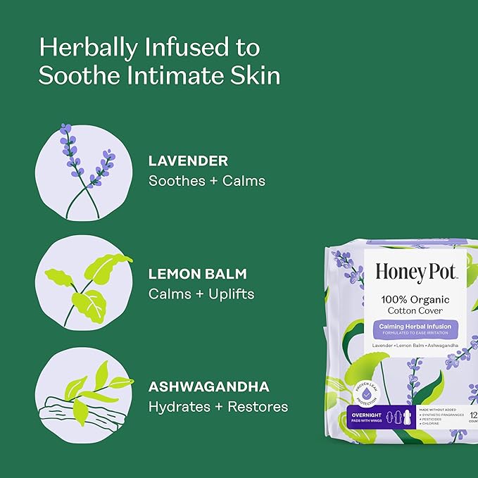 Honey Pot 100% Organic Cotton Cover Calming Herbal Infusion Overnight Pads, 12 Count