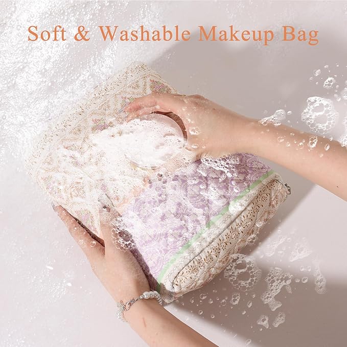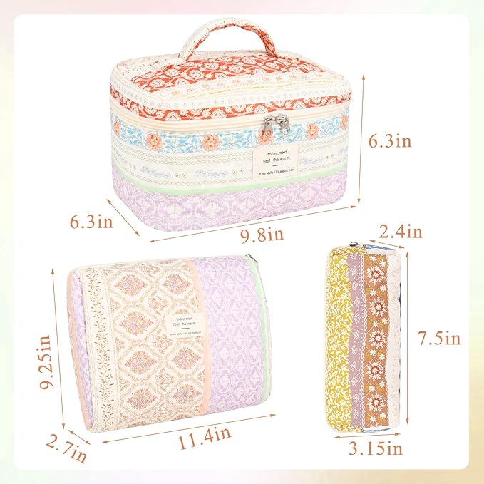 Anfly Makeup Bag, Quilted Cosmetic Bags, Large Floral Make Up Bag, Cute Makeup Bag 3PC Set for Women Girls (Color Clash)