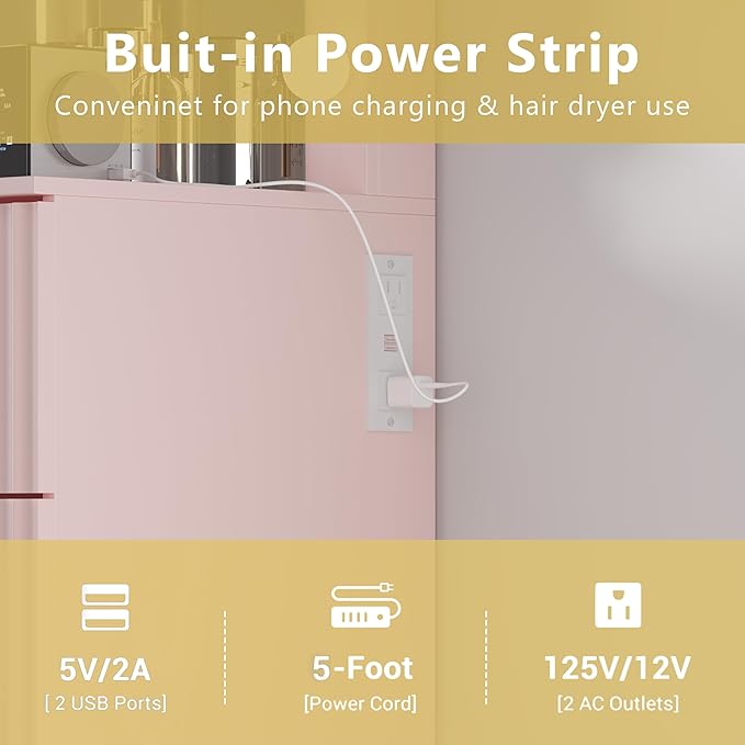 - Built-In Charging Station: Includes two standard power outlets and two USB ports, making it easy to charge your phone, tablet, hair dryer, or curling iron while getting ready. BORNOON makeup vanity desk with lighted mirror keeps all your beauty tools and devices fully powered, streamlining your daily routine and minimizing clutter. A practical upgrade for modern dressing needs.