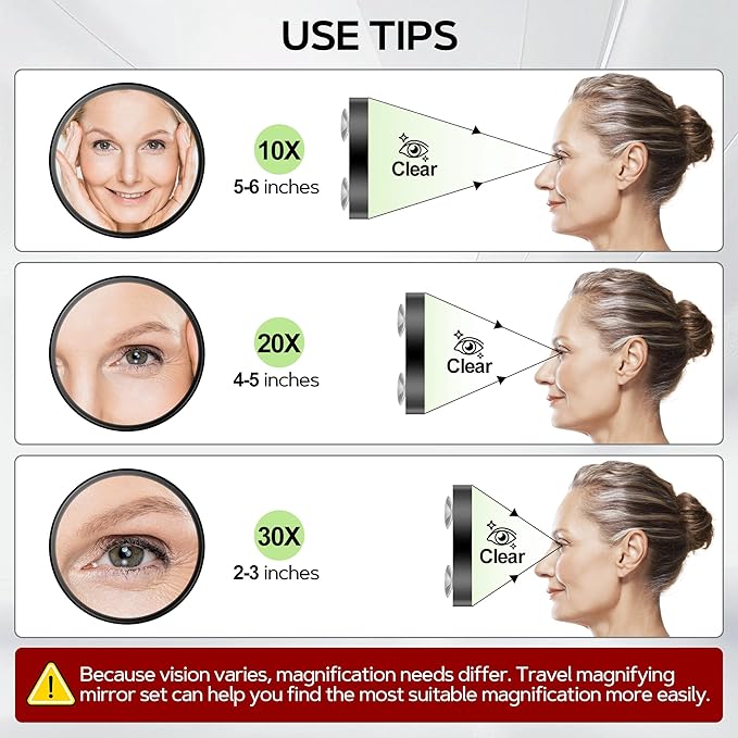 - Magnifying Mirror: This travel makeup mirror set includes 10X, 20X, and 30X magnification: 10X for daily skincare and makeup application, 20X for daily skin checks (pores, blemishes), and 30X for precise eye makeup (eyeliner, mascara).