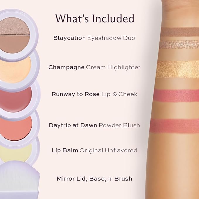 - 5-IN-1 TRAVEL MAKEUP KIT: perfect for travel, but made for every day, our 5-in-1 stackable travel kit contains our best-selling eyeshadow duo, powder blush, cream highlighter, a lip & cheek tint, lip balm, a travel mirror and mini brush.