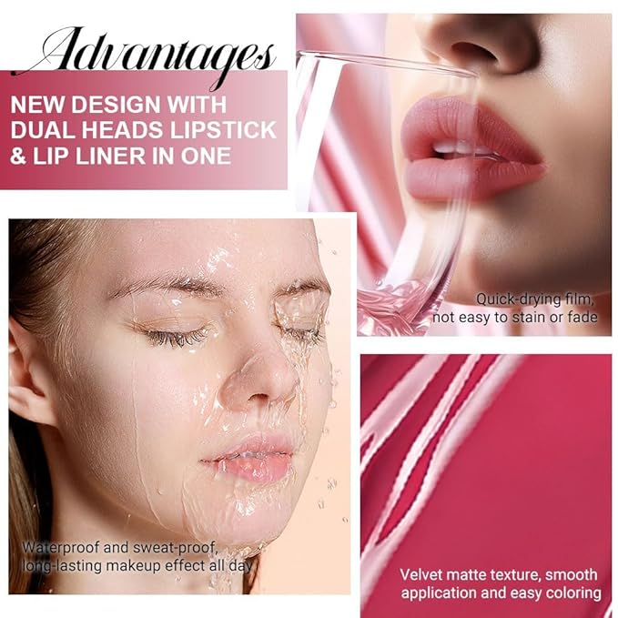 - 【2 IN 1 Lip Liner & Liquid Lipstick】The double ended design made you can use lipstick and lip liner on both ends. New design with dual heads lipstick & lip liner in one, for draw delicate lip line before applying lipstick. It combines lip line and liquid lipstick and makes double-end lipstick more perfect,meets the need of all occasions